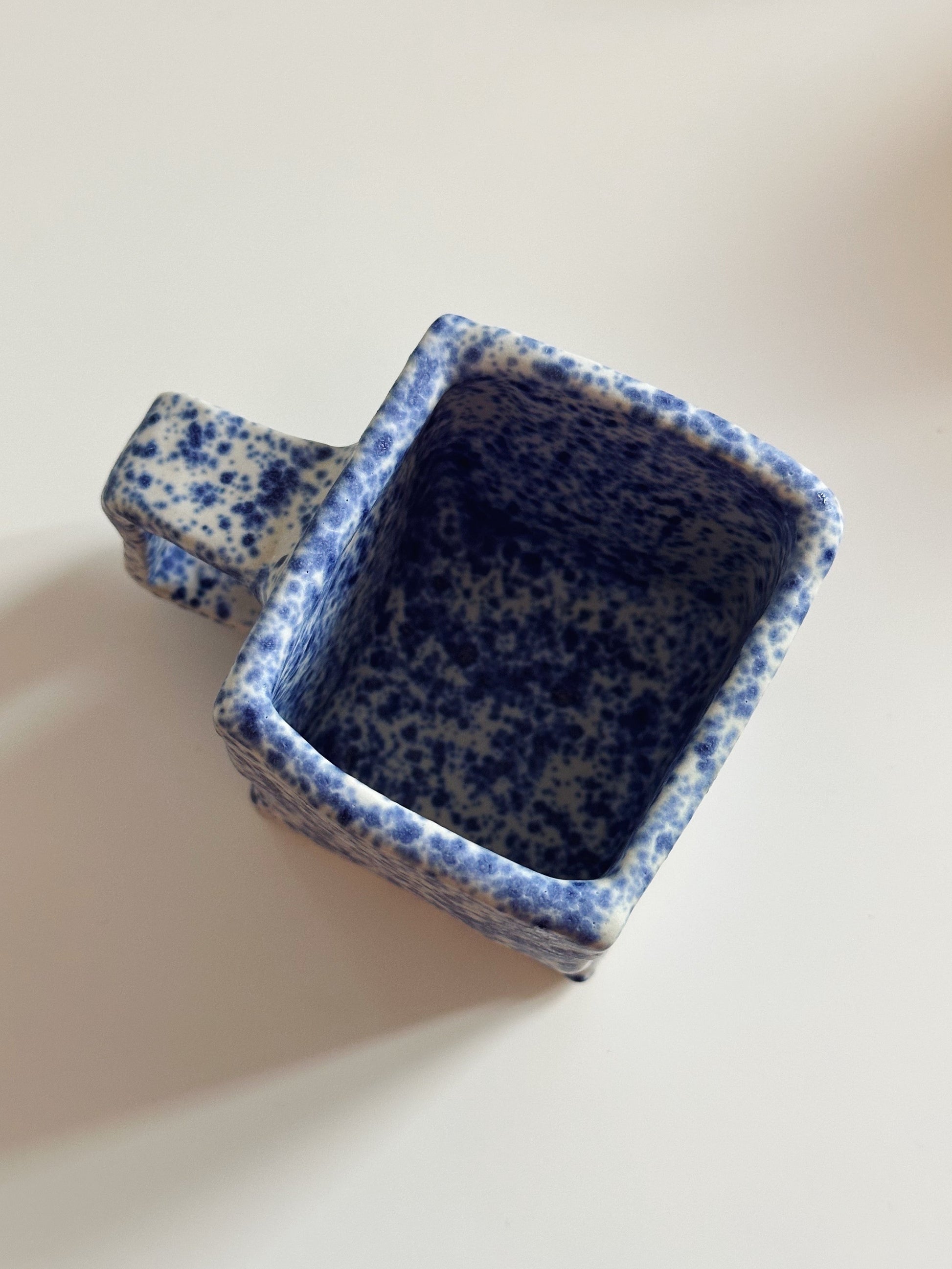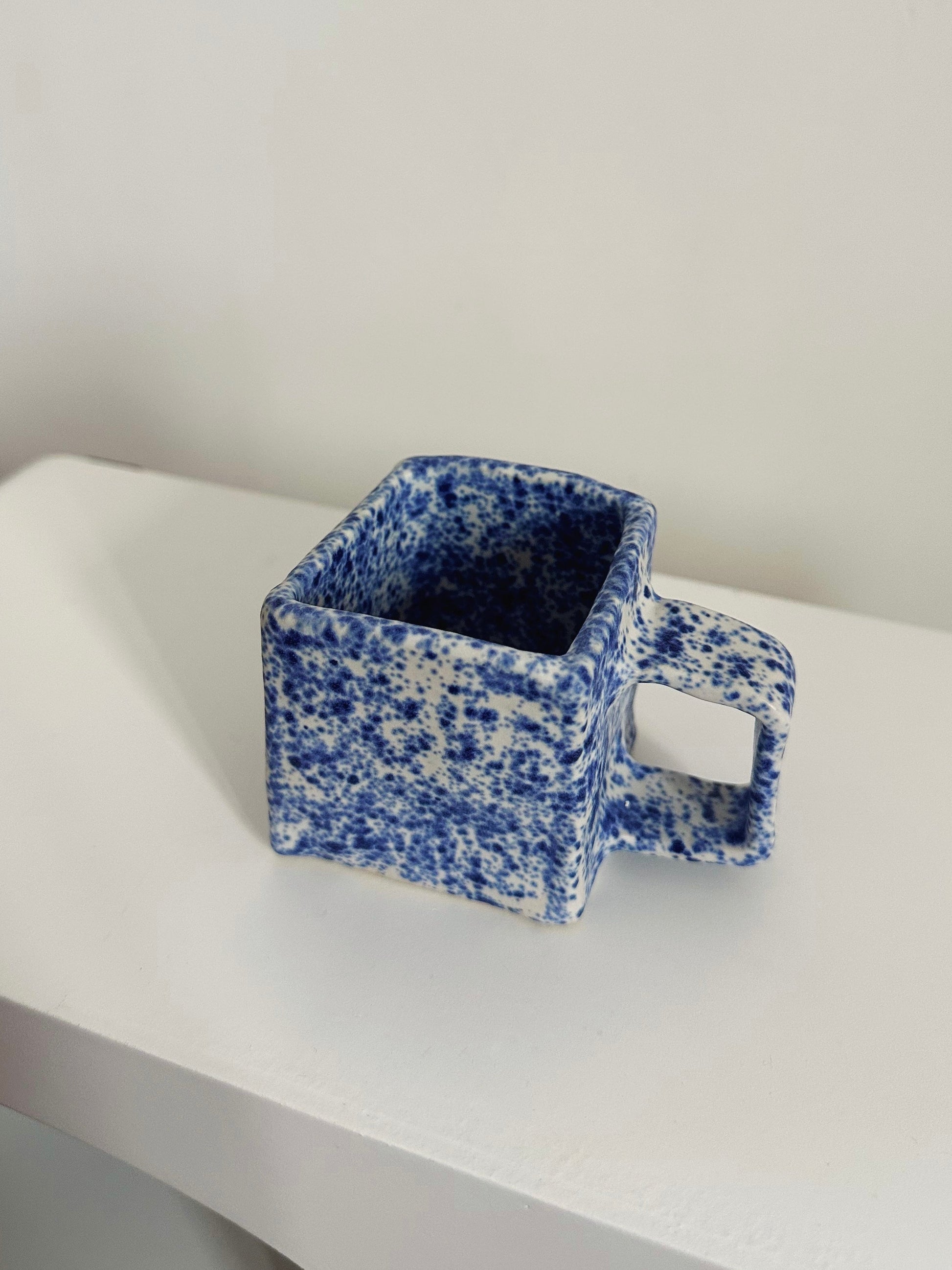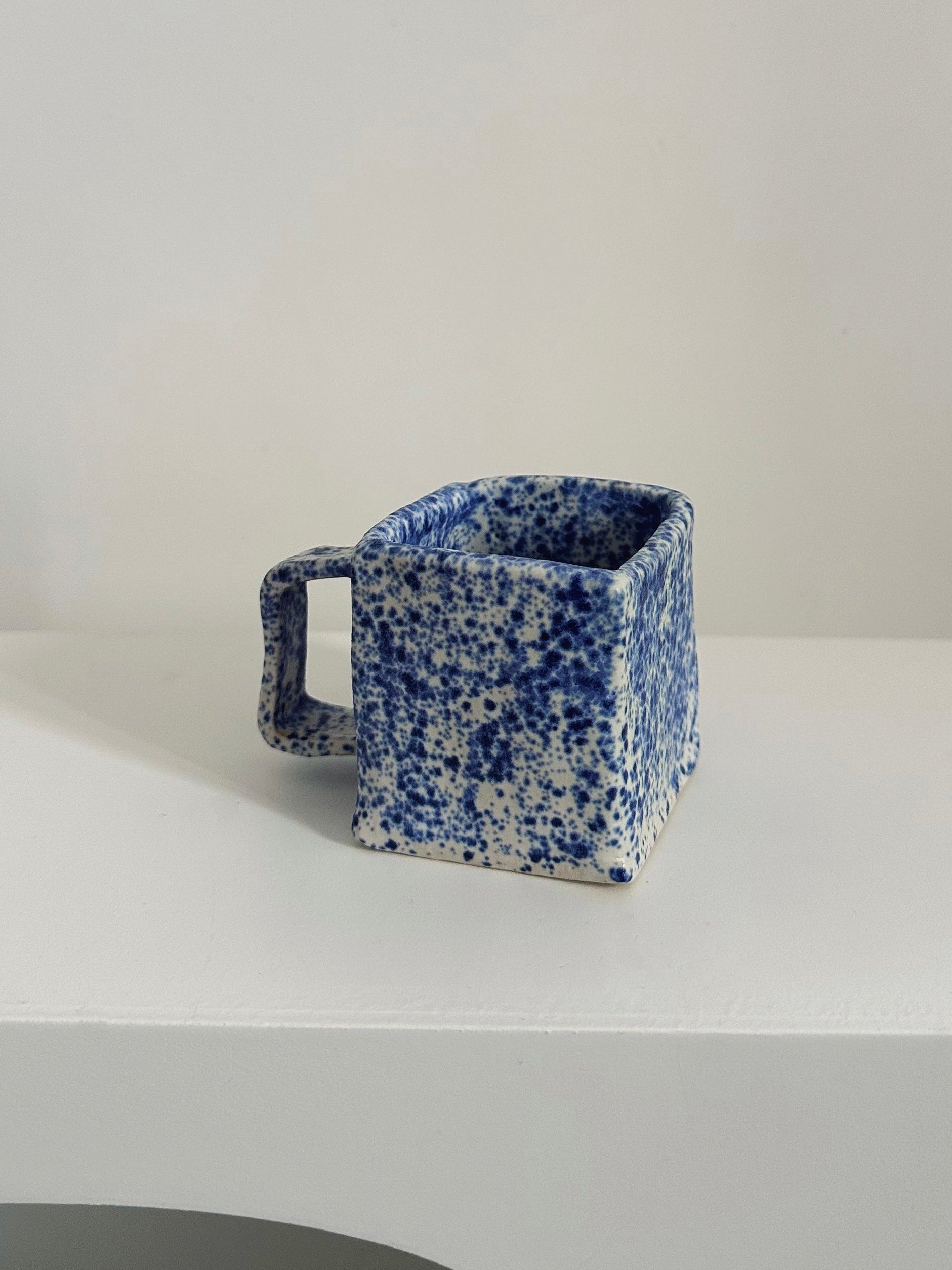 Tasse carrée bleue mouchetée entièrement façonnée et émaillée à la main